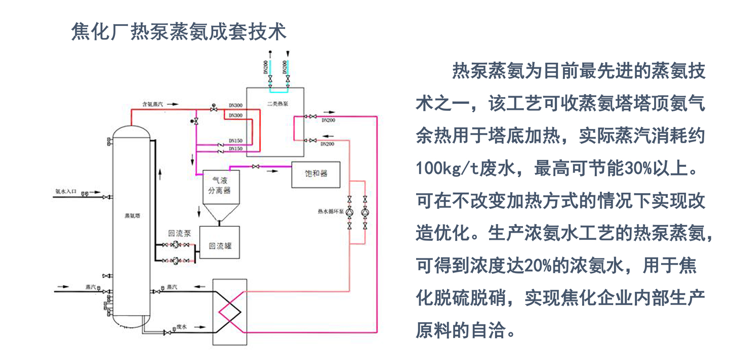 熱泵蒸氨為目前最先進的蒸氨技術(shù)之一,該工藝可收蒸氨塔塔頂氨氣余熱用于塔底加熱,實際蒸汽消耗約100kg/t廢水,最高可節(jié)能30%以.上??稍诓桓淖兗訜岱绞降那闆r下實現(xiàn)改造優(yōu)化。生產(chǎn)濃氨水工藝的熱泵蒸氨,可得到濃度達20%的濃氨水,用于焦化脫硫脫硝,實現(xiàn)焦化企業(yè)內(nèi)部生產(chǎn)原料的自治。