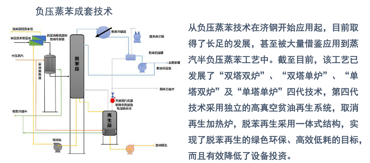 從負(fù)壓蒸苯技術(shù)在濟(jì)鋼開始應(yīng)用起,目前取得了長(zhǎng)足的發(fā)展,甚至被大量借鑒應(yīng)用到蒸汽半負(fù)壓蒸苯工藝中。截至目前,該工藝已發(fā)展了“雙塔雙爐”、“雙塔單爐”、“單塔雙爐”及“單塔單爐”四代技術(shù),第四代技術(shù)采用獨(dú)立的高真空貧油再生系統(tǒng),取消再生加熱爐,脫苯再生采用一體式結(jié)構(gòu),實(shí)現(xiàn)了脫苯再生的綠色環(huán)保、高效低耗的目標(biāo),而且有效降低了設(shè)備投資。